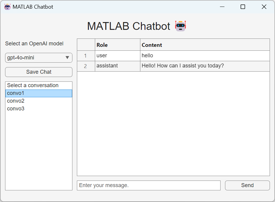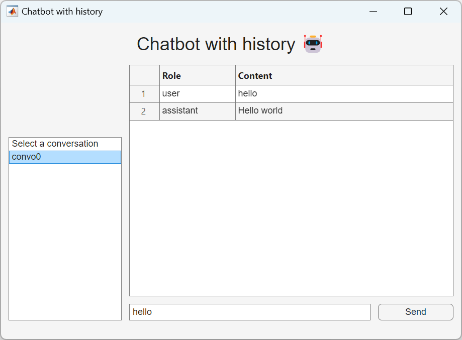When you send your message by clicking on the button, the conversation is saved in the “convo1.mat” file and you can display it by selecting “convo1” in the dropdown.