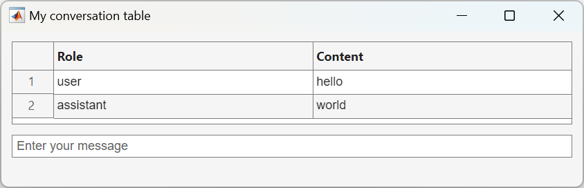 As you can see from the messages object passed to the OpenAI chat client, it consists of a cell array of struct, each entry containing a role (either user or assistant) and a content entry.
