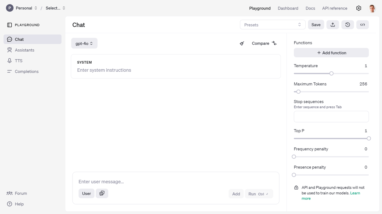 /!\ As an important data privacy disclaimer, API and Playground requests will not be used to train OpenAI models. This isn’t the case of the public ChatGPT App, which by default can learn from users’ conversations.