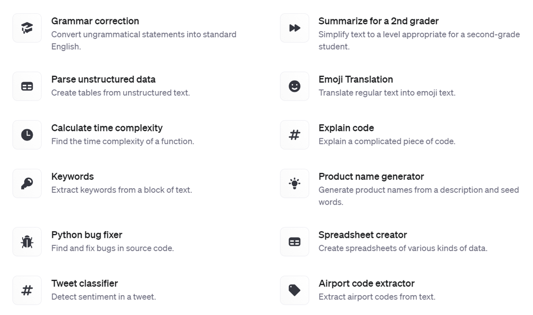 This will give you an experience close to the one you have with the ChatGPT web app. But from there you will be able to access more advanced parameters of the model and view the code necessary to replicate the call to the API from your own program. If you are lacking inspiration, and you don’t know where to start, you will find some prompt examples from the presets in the documentation2.