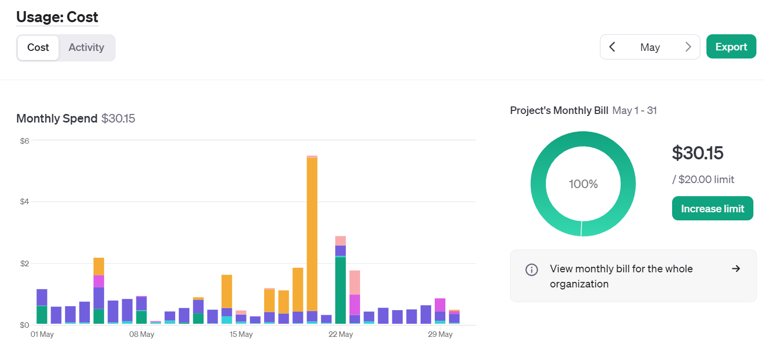 To give you a sense of the cost of using the API on a daily basis, here is a view over the month of May, where I spend the most of my time writing this book and developing the associated GPTs.