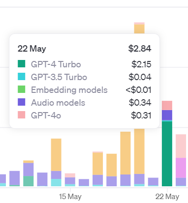 If you hover over the graphic, you can see the breakdown by service (image, audio, embeddings, …) or by model (3.5, 4o, …). The big spike mid-month was due to the Dall-E 3 service usage for over $5 on 1 day.